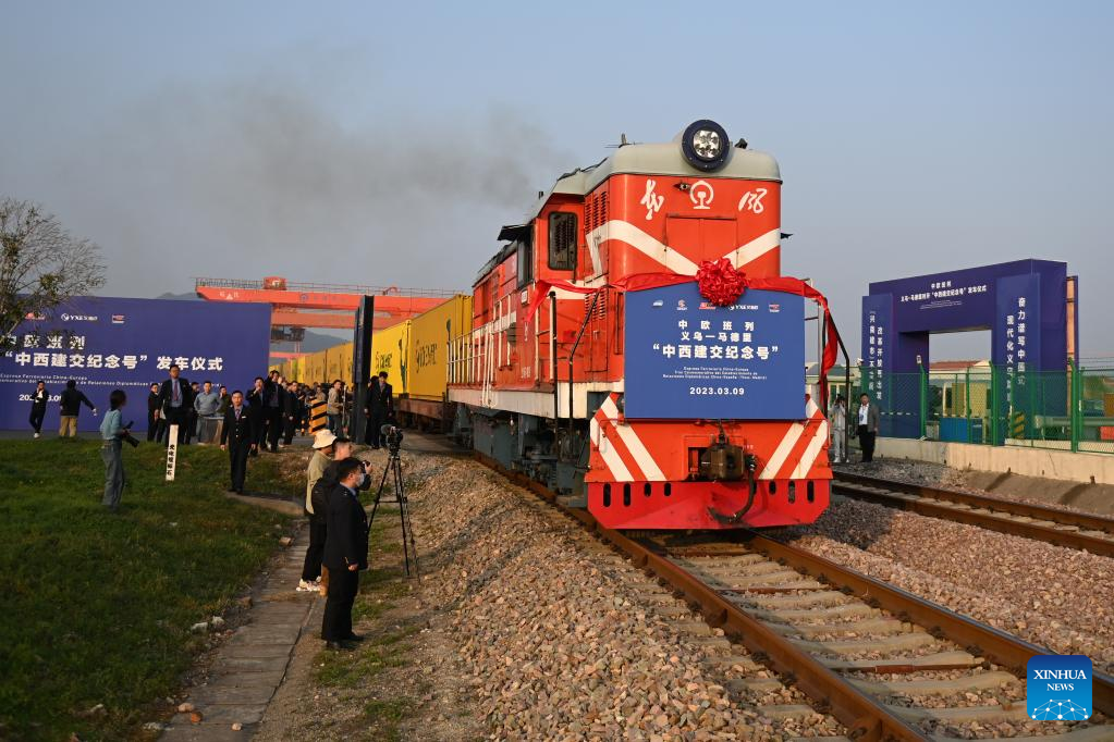 Un tren de mercancías sale de la estación de Yiwu Oeste en la provincia oriental china de Zhejiang, 9 de marzo de 2023. Una unidad China-Europa con 100 contenedores estándar bienes pequeños y productos de cerámica fabricados en China partió el jueves de Yiwu, un importante centro de pequeñas mercancías en la provincia oriental de Zhejiang, con destino a Madrid, España.