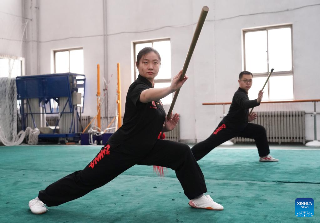 Li Jinqi (izquierda) practica Qiangshu, lanzas, con un compañero del club de artes marciales de la Universidad de Beihang en Beijing, capital de China, 11 de marzo de 2023.
