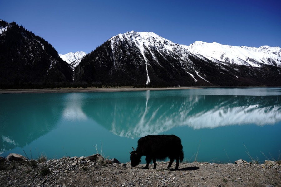 Una foto tomada el 27 de abril de 2020 muestra el paisaje del lago Ranwu en la región autónoma del Tíbet en el suroeste de China. Con montañas cubiertas de nieve en la distancia, el agua tranquila del lago azul turquesa se ve aún más pintoresca en primavera.