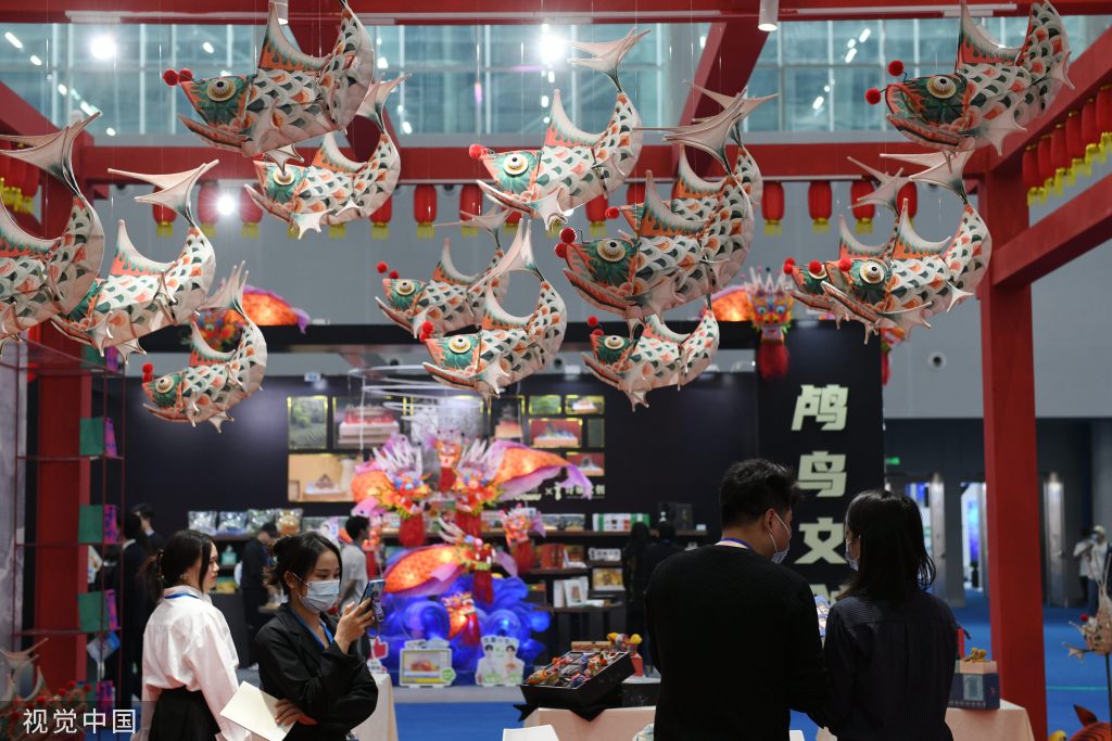 La gente visita el área de productos culturales y creativos en la exhibición de la industria cultural en Guangzhou, provincia de Guangdong, el 9 de marzo de 2023. [Foto/VCG]