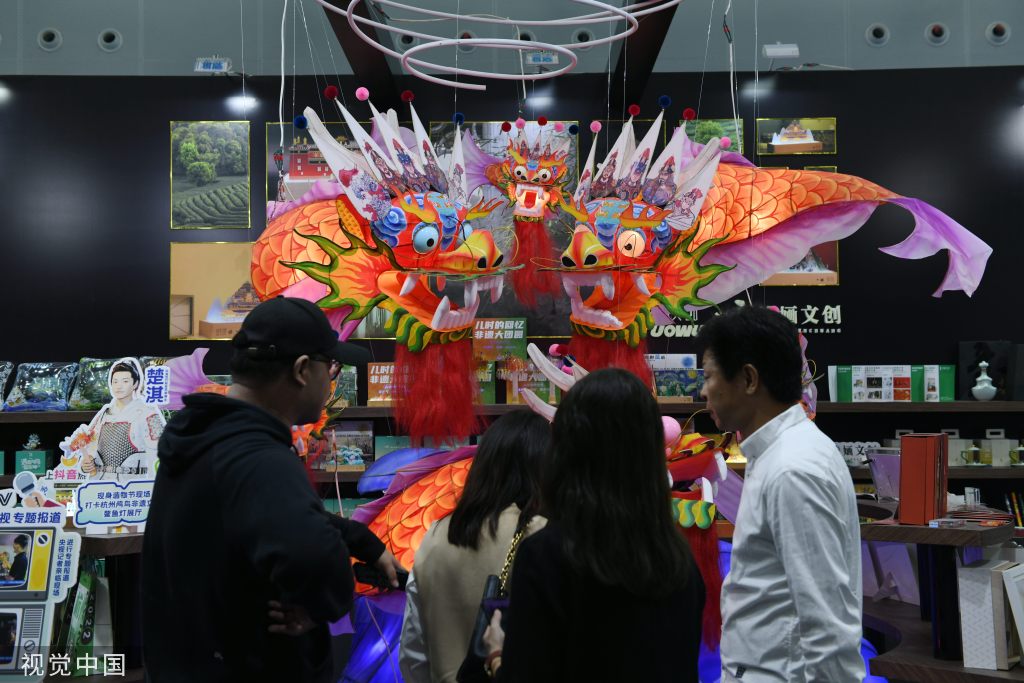 La gente visita el área de productos culturales y creativos en la exhibición de la industria cultural en Guangzhou, provincia de Guangdong, el 9 de marzo de 2023. [Foto/VCG]
