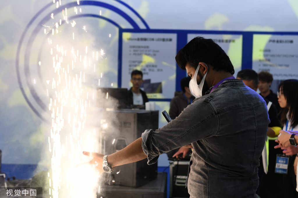 Un comprador prueba una máquina electrónica de fuegos artificiales en la exposición de la industria cultural en Guangzhou, provincia de Guangdong, el 9 de marzo de 2023. [Foto/VCG]