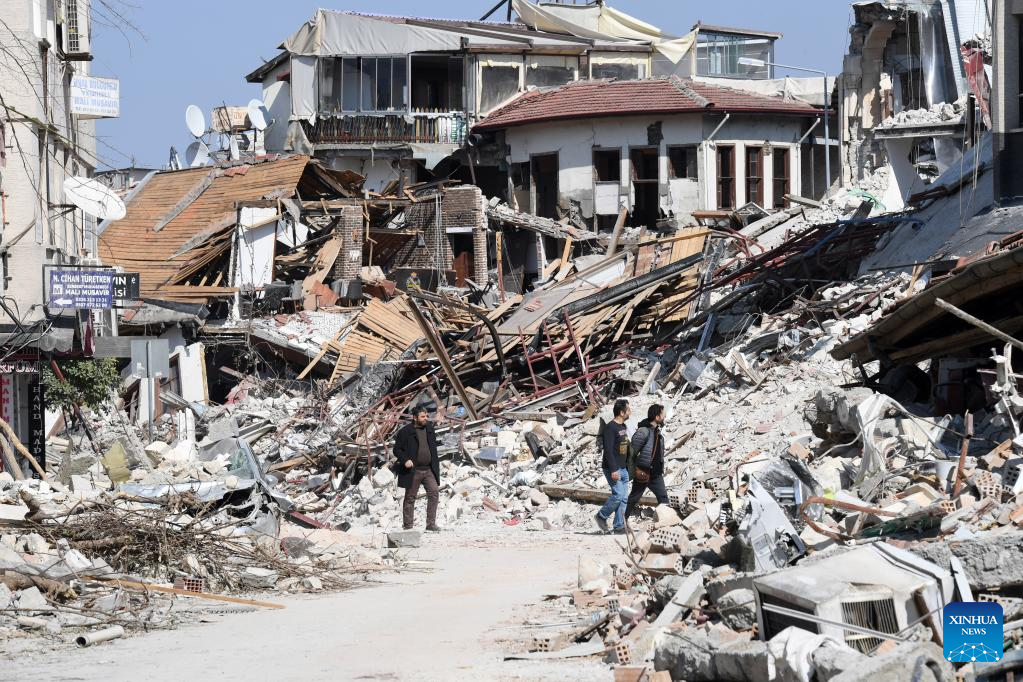 Unas personas pasan el 7 de marzo de 2023 junto a un edificio derruido por el terremoto que sacudió la ciudad de Antakya, en Turqía. (Foto/Xinhua.)