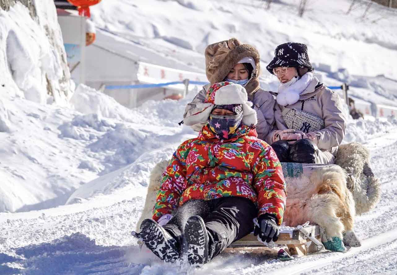 Turistas en trineo en la montaña Changbai, provincia nororiental de Jilin, 2 de febrero de 2023.