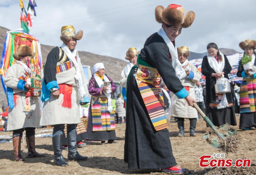 Los aldeanos participan en una ceremonia que marca el inicio de la temporada de arado de este año en Lhasa, en el suroeste de la región autónoma del Tíbet.
