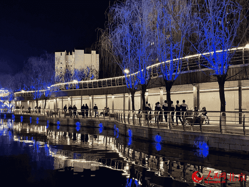La foto muestra a peatones caminando a orillas del río Liangma en Beijing, capital de China.