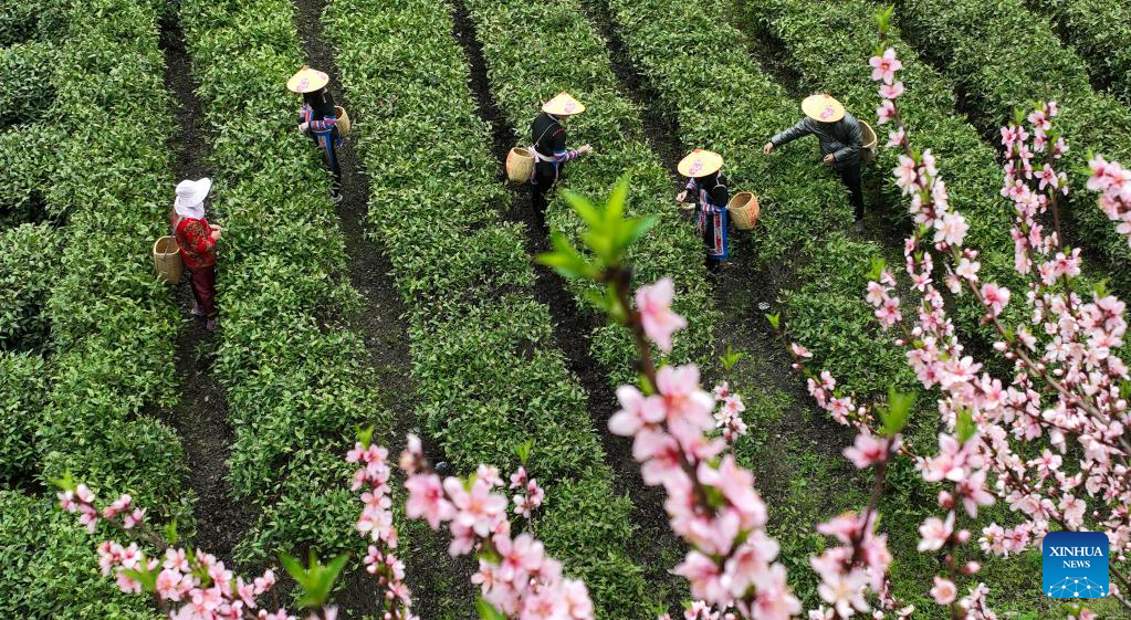 Esta foto aérea tomada el 20 de marzo de 2023 muestra a los agricultores recogiendo hojas de té en Tashan, ciudad de Changning, en la provincia central china de Hunan. Los productores de té en Tashan están ocupados recogiendo y procesando hojas de té en la temporada de cosecha. La economía local se está viendo impulsada a medida que la industria de plantación de té en Tashan se integra con el turismo. (Xinhua/Zhao Zhongzhi)