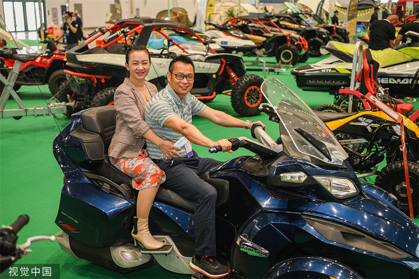 Prueba de una motocicleta en la II Exposición de importación de artículos y equipos deportivos de China (Hainan) en Haikou, provincia de Hainan, 25 de marzo de 2023.
