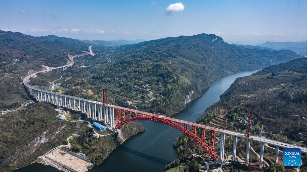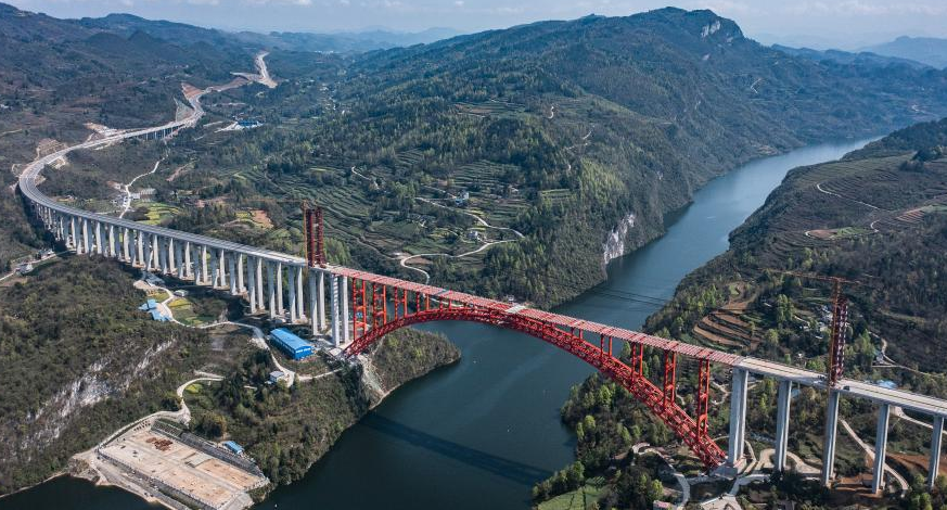 La obra del cuerpo principal del puente Wujiang en la provincia suroccidental china de Guizhou llega a su fin
