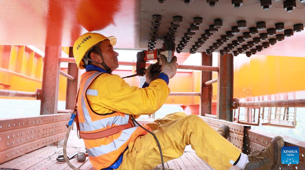 La obra del cuerpo principal del puente Wujiang en la provincia suroccidental china de Guizhou llega a su fin