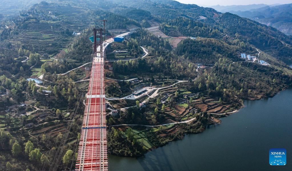 La obra del cuerpo principal del puente Wujiang en la provincia suroccidental china de Guizhou llega a su fin