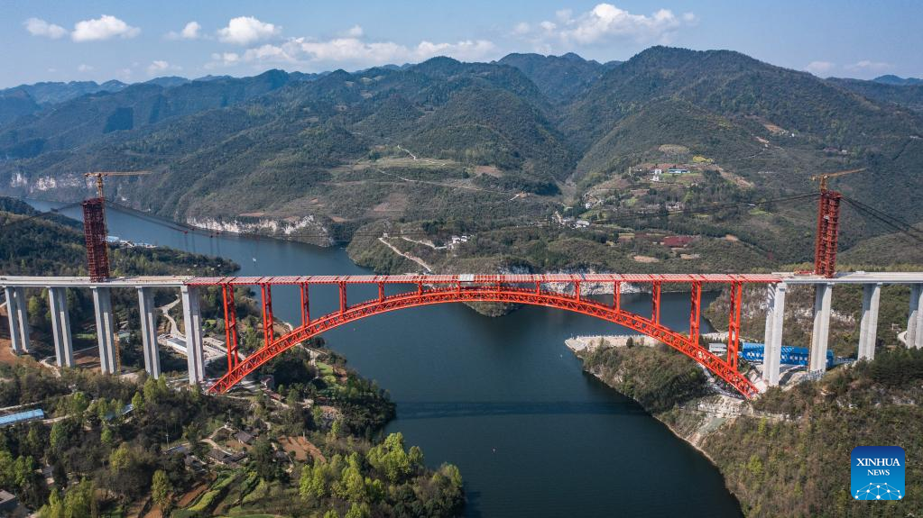 La obra del cuerpo principal del puente Wujiang en la provincia suroccidental china de Guizhou llega a su fin