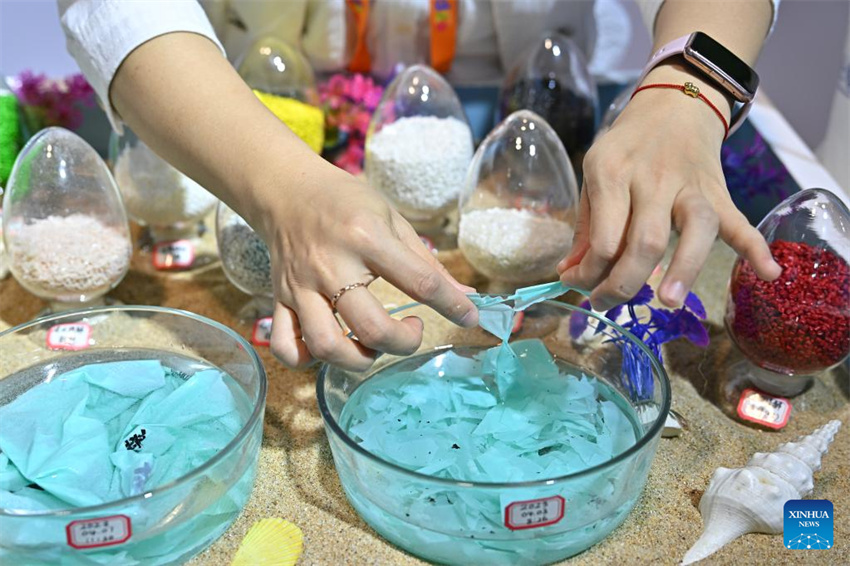 Presentación de un tipo de material de rápida degradación en la III Exposición Internacional de Productos de Consumo de China (CICPE, por sus siglas en inglés) en Haikou, capital de la provincia sureña de Hainan, 11 de abril de 2023. La producción y consumo ecológicos y bajos en carbono son visibles en muchas áreas de exhibición. (Xinhua)