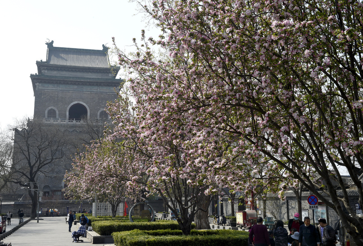La Torre del Tambor rodeada de flores en Beijing, el 30 de marzo de 2023. [Foto/Xinhua]