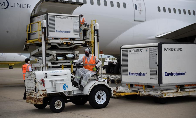 Los trabajadores descargan vacunas de la farmacéutica china Sinovac a su llegada a Montevideo, Uruguay. Foto de archivo: Xinhua.
