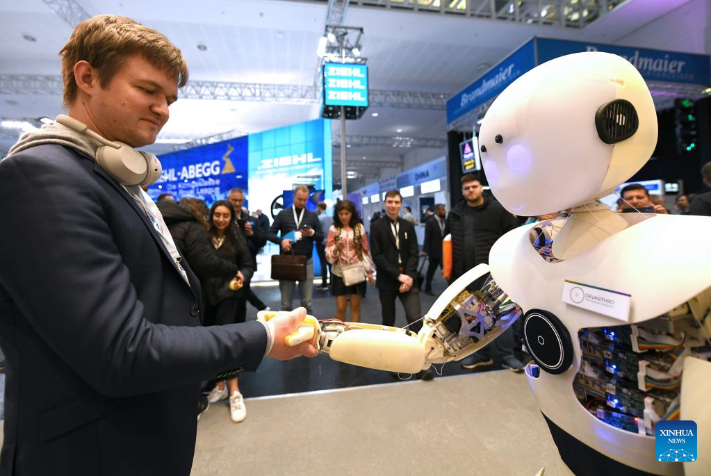 Un hombre estrecha la mano de un robot inteligente durante la Hannover Messe en Alemania, el 18 de abril de 2023. La principal feria comercial de ingeniería mecánica y eléctrica de Alemania comenzó el lunes en Hannover, bajo el tema "Transformación industrial: marcando la diferencia". (Xinhua/Ren Pengfei)