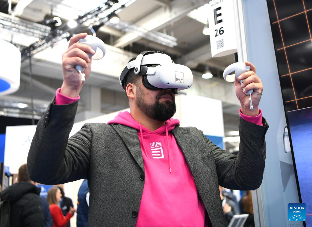 Un hombre se prueba un casco con gafas de realidad virtual durante la Hannover Messe en Alemania, el 18 de abril de 2023. La principal feria comercial de ingeniería mecánica y eléctrica de Alemania comenzó el lunes en Hannover, bajo el tema "Transformación industrial: marcando la diferencia". (Xinhua/Ren Pengfei)