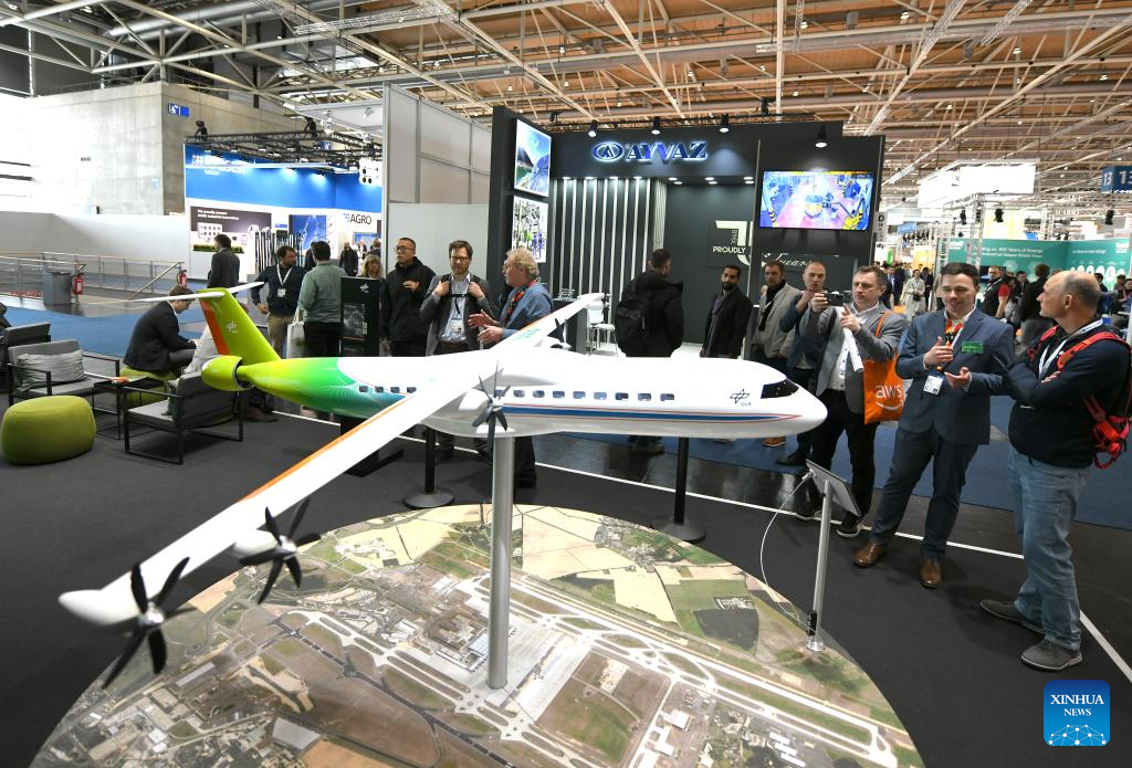 Los visitantes observan un modelo de avión impulsado por hidrógeno durante la Hannover Messe en Alemania, el 17 de abril de 2023. La principal feria comercial de ingeniería mecánica y eléctrica de Alemania comenzó el lunes en Hannover, bajo el tema "Transformación industrial: marcando la diferencia". (Xinhua/Ren Pengfei)