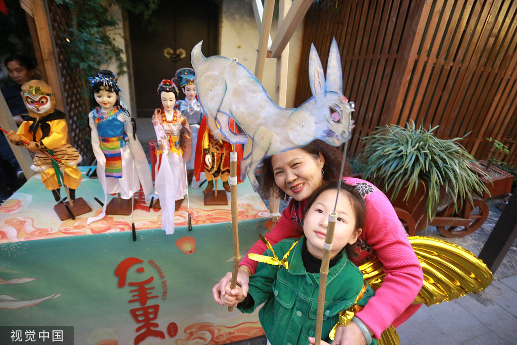 Una niña aprende a jugar con una artesanía artística en forma de conejo en un distrito histórico y cultural de Yangzhou, provincia de Jiangsu, el 14 de abril de 2023. [Foto/VCG]