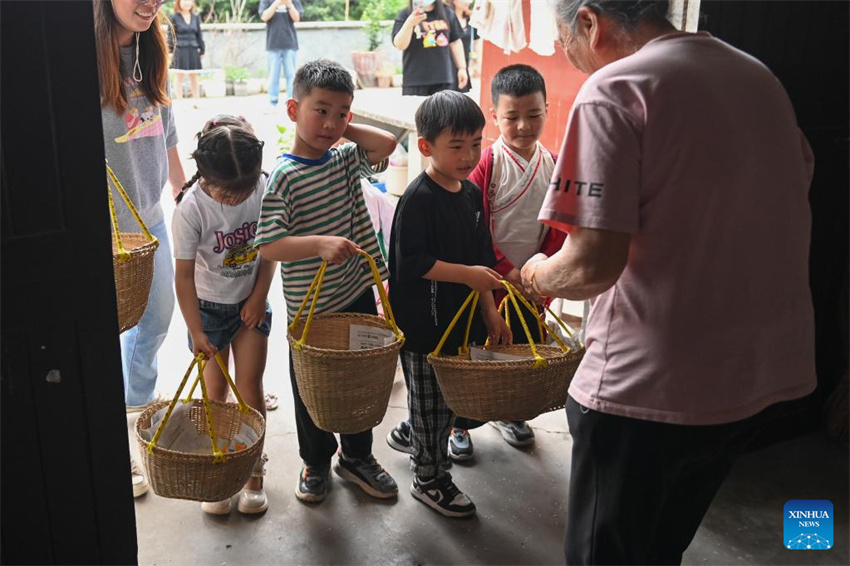Los niños recogen arroz de los vecinos para preparar comidas en la aldea de Dingshanhe, municipio de Tangqi, distrito de Linping de Hangzhou, provincia oriental china de Zhejiang, el 4 de mayo de 2023. Los aldeanos se preparan para la llegada de "Lixia", o comienzo del verano, elaborando varios tipos de comida tradicional. "Lixia" cae el 6 de mayo de este año. (Xinhua/Huang Zongzhi)