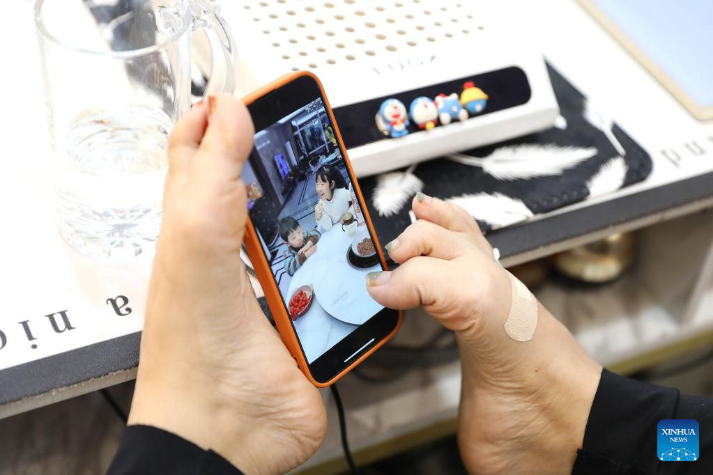 Han Dan mira un video de sus hijos en su teléfono móvil en su casa en Fuxin, provincia nororiental china de Liaoning, el 11 de mayo de 2023. Han Dan perdió sus brazos a la edad de 6 años, pero gradualmente logró aprender a escribir y nadar. Cuando tenía 27 años, Han se casó y comenzó su propio negocio. Como empresaria, ha superado dificultades y ganado más de un millón de seguidores en Internet. Como madre de dos hijos, cuida bien de ellos y está a punto de dar a luz a su tercero.