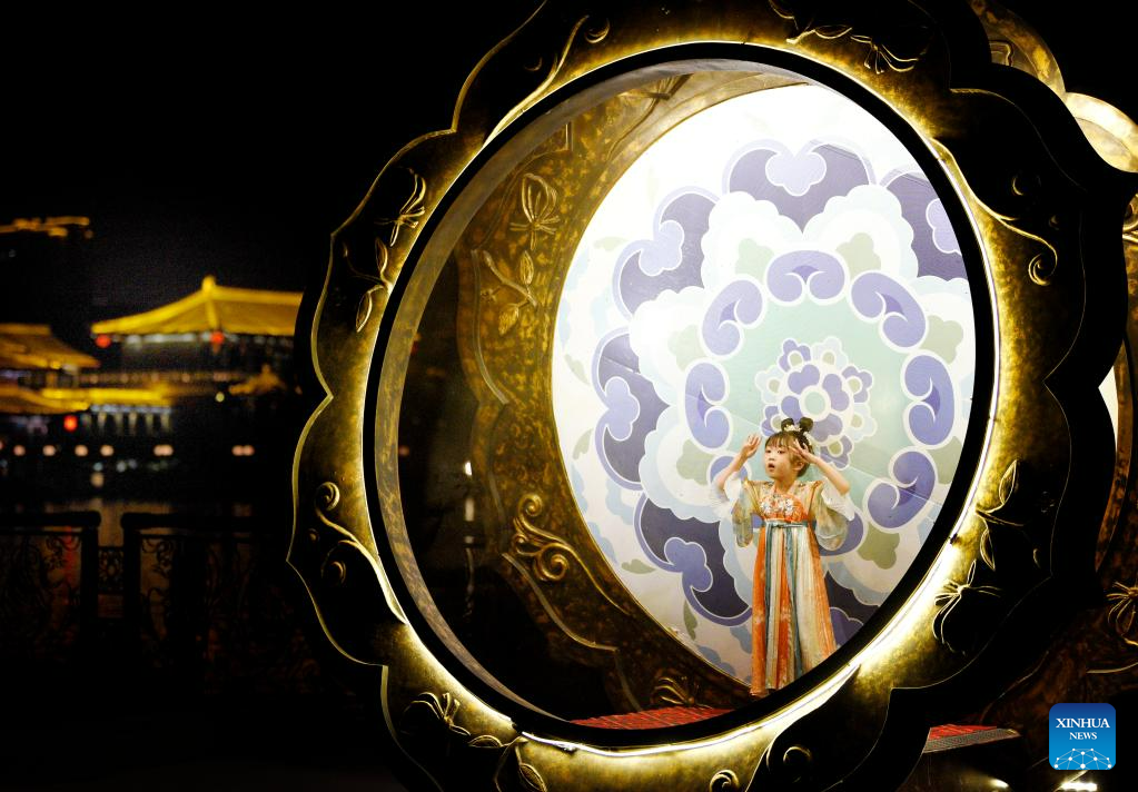 Una niña visita el Paraíso Tang en Xi'an, provincia de Shaanxi, noroeste de China, el 19 de abril de 2023. El Paraíso Tang, ubicado en el sur de Xi'an, es un gran parque temático cultural que muestra el estilo de vida de la próspera dinastía Tang (618-907). (Foto de Zou Jingyi/Xinhua)