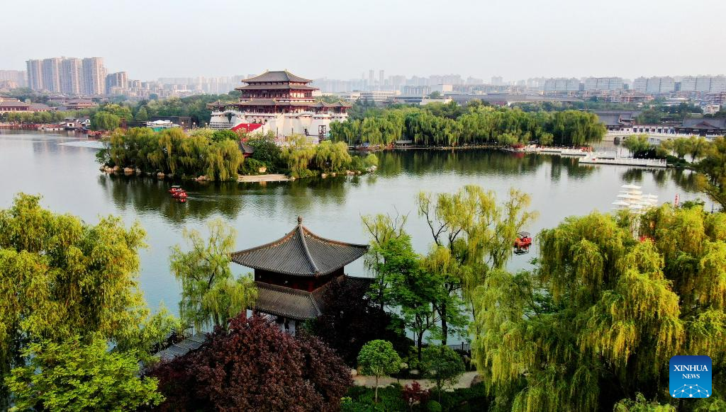 Esta foto aérea tomada el 19 de abril de 2023 muestra la vista del Paraíso Tang en Xi'an, provincia de Shaanxi, noroeste de China. El Paraíso Tang, ubicado en el sur de Xi'an, es un gran parque temático cultural que muestra el estilo de vida de la próspera dinastía Tang (618-907). (Xinhua/Liu Xiao)