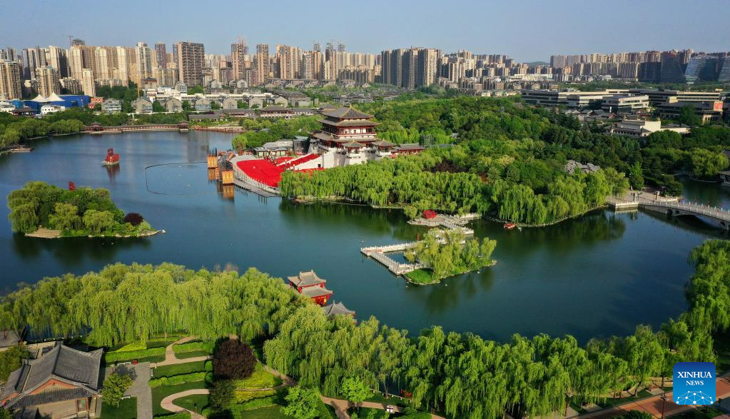Esta foto aérea tomada el 25 de abril de 2023 muestra la vista del Paraíso Tang en Xi'an, provincia de Shaanxi, noroeste de China. El Paraíso Tang, ubicado en el sur de Xi'an, es un gran parque temático cultural que muestra el estilo de vida de la próspera dinastía Tang (618-907). (Xinhua/Liu Xiao)