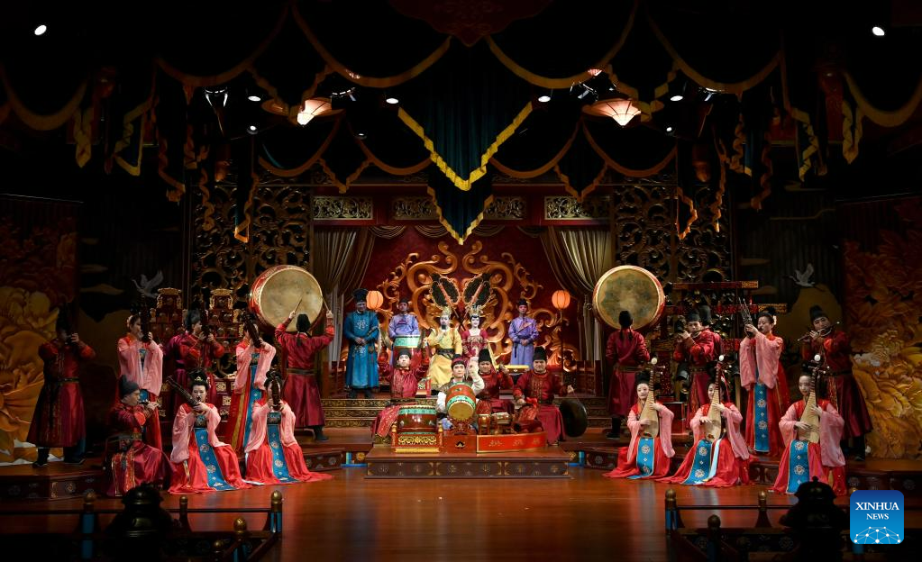 Los actores representan una obra de teatro en el Paraíso Tang en Xi'an, provincia de Shaanxi, noroeste de China, el 24 de enero de 2023. El Paraíso Tang, ubicado en el sur de Xi'an, es un gran parque temático cultural que muestra el estilo de vida de la próspera dinastía Tang (618-907). (Xinhua/Liu Xiao)