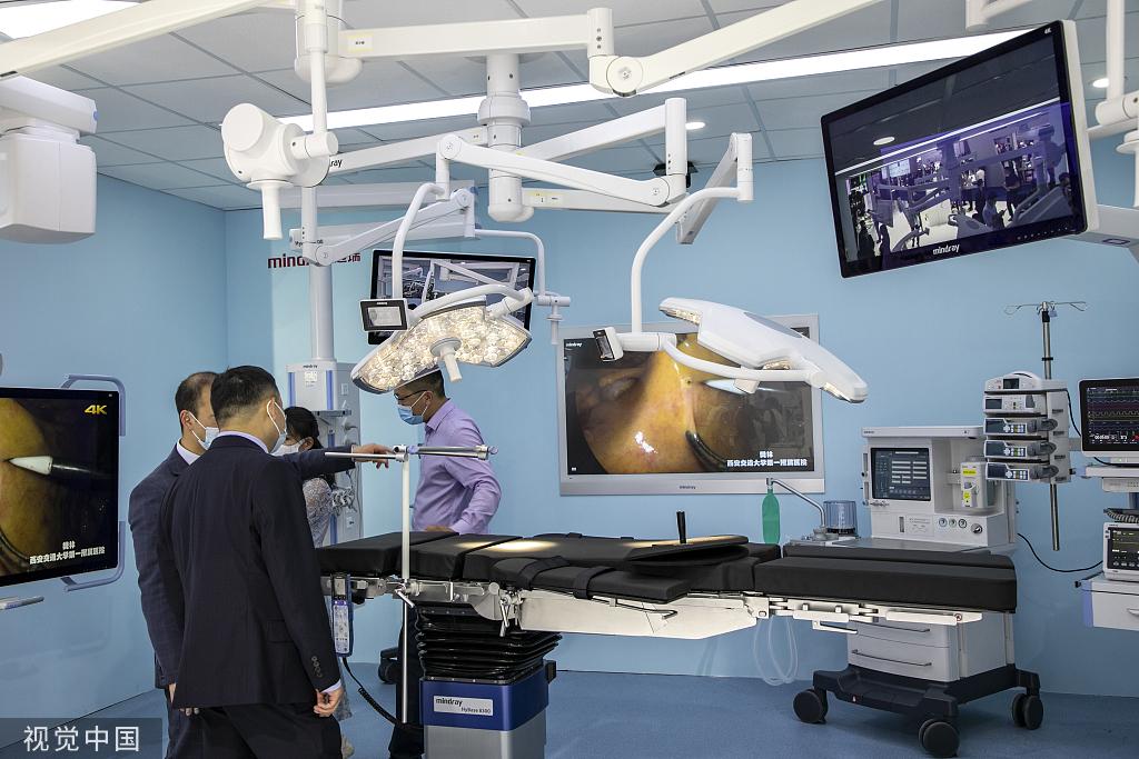 Los visitantes de Mindray Bio-Medical Electronics Co Ltd visitan una sala de operaciones inteligente en el stand de Mindray en la Feria Internacional de Equipos Médicos de China 2021 en Shanghai, el 14 de mayo de 2021. [Foto/VCG]