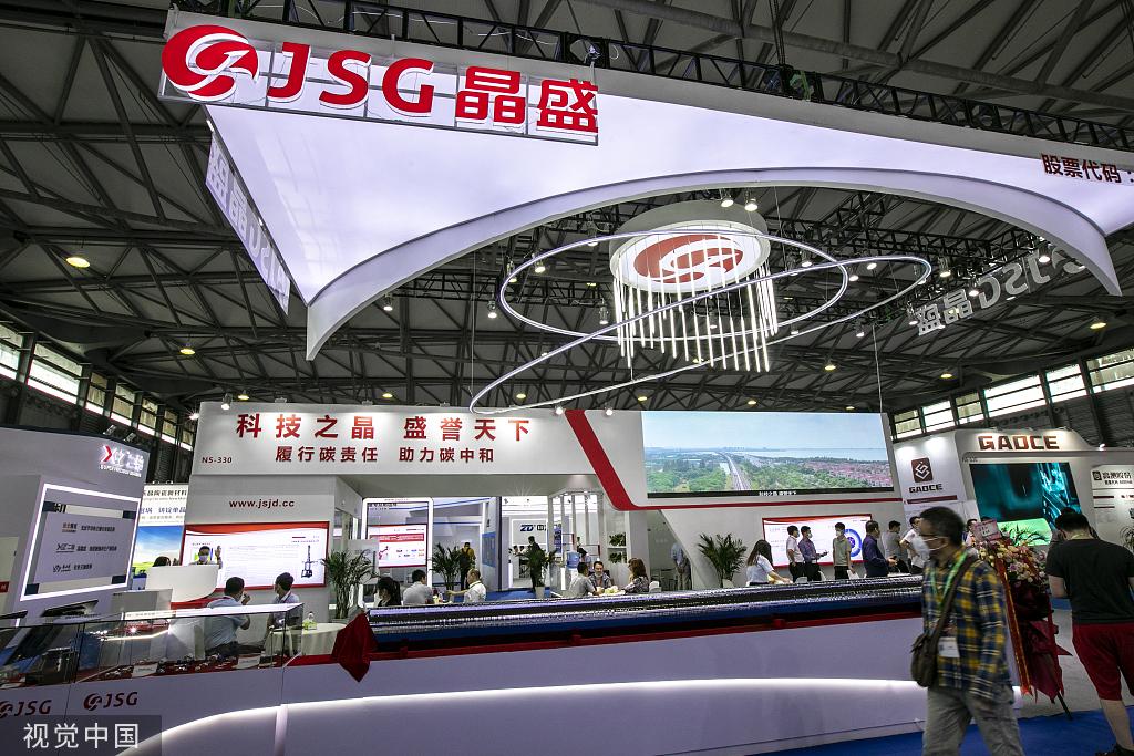Los visitantes conversan en el stand de Zhejiang Jingsheng Mechanical and Electrical durante la XIII Exposición Internacional de Generación de Energía Fotovoltaica y Energía Inteligente SNEC en Shanghai, el 5 de junio de 2019. [Foto/VCG]