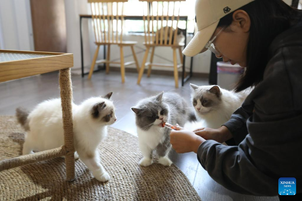 La dueña de un café con gatos alimenta a los gatos en la aldea de Lizu, ciudad de Yiwu, provincia oriental china de Zhejiang, el 23 de mayo de 2023.