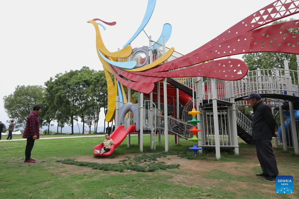Un niño juega en un tobogán en la aldea de Pushan del distrito de Longyou, provincia oriental china de Zhejiang, el 24 de mayo de 2023. La aldea de Pushan ha renovado su aspecto en los últimos años gracias a una mejora de la infraestructura pública y a una decoración colorida. También se han desarrollado instalaciones de entretenimiento y negocios de alojamiento en casas con familias para impulsar el turismo y aumentar los ingresos de los aldeanos locales, inyectando impulso y vitalidad a la revitalización rural. (Xinhua/Du Xiaoyi)