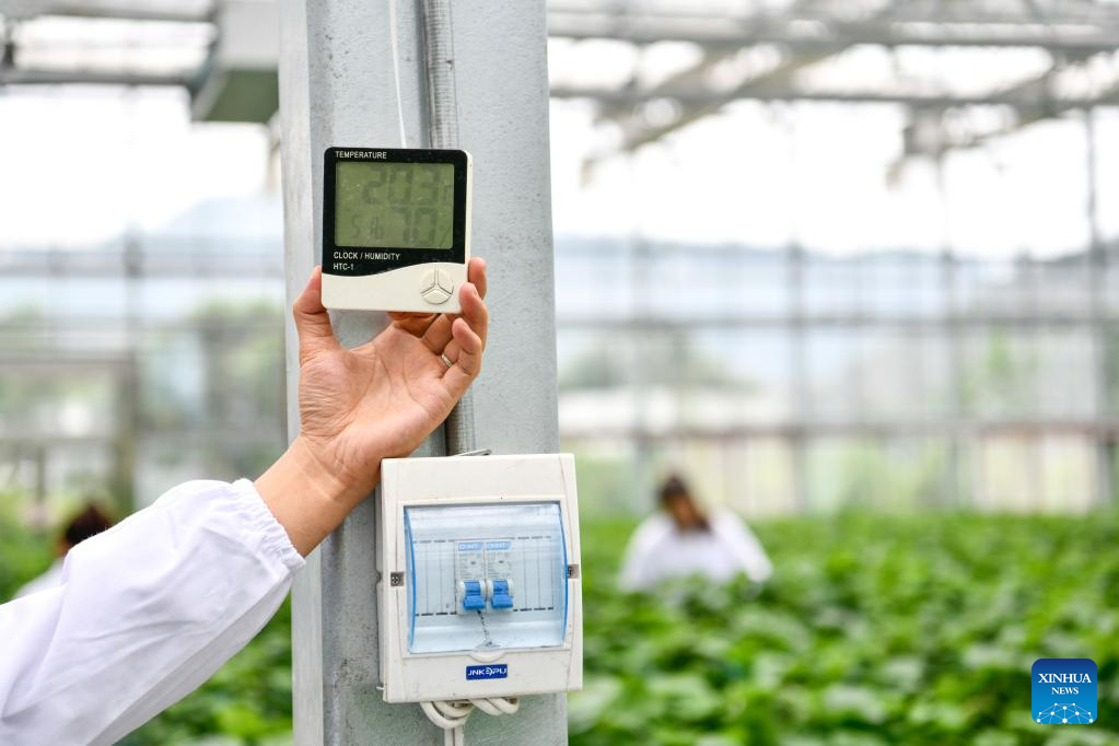 Un trabajador verifica la temperatura y la humedad en un invernadero de plántulas en el distrito de Kaiyang de Guiyang, provincia de Guizhou, suroeste de China, el 23 de mayo de 2023. En los últimos años, basándose en el desarrollo de los macrodatos, la provincia de Guizhou ha acelerado la promoción y aplicación de nuevos modelos de agricultura inteligente, a fin de mejorar la eficiencia de la producción agrícola. (Xinhua/Yang Wenbin)