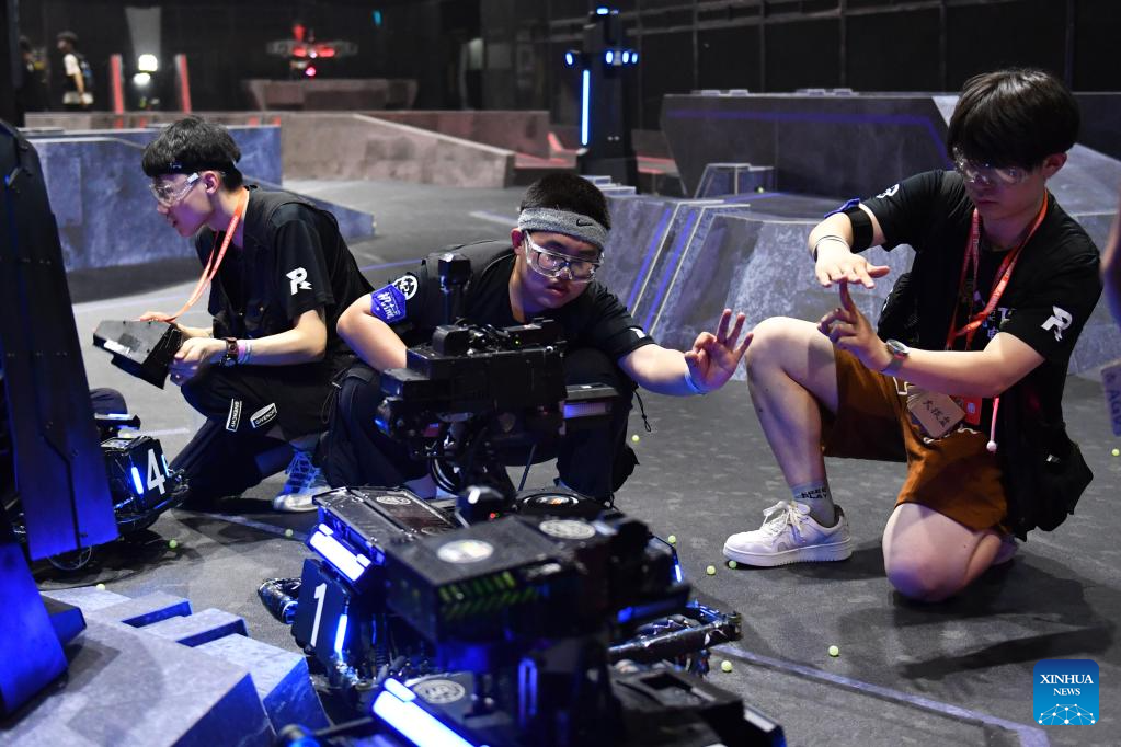 Concursantes del equipo TOE de la Universidad Jiaotong de Dalian prueban sus robots durante la Competición Regional del Campeonato Universitario RoboMaster 2023 (sur de China) en Changsha, provincia central china de Hunan, el 28 de mayo de 2023. La competición regional de cuatro días concluyó en Changsha el domingo, con la victoria del equipo RobotPilots de la Universidad de Shenzhen y el equipo TOE de la Universidad Jiaotong de Dalian en segundo lugar. (Xinhua/Chen Zhenhai)