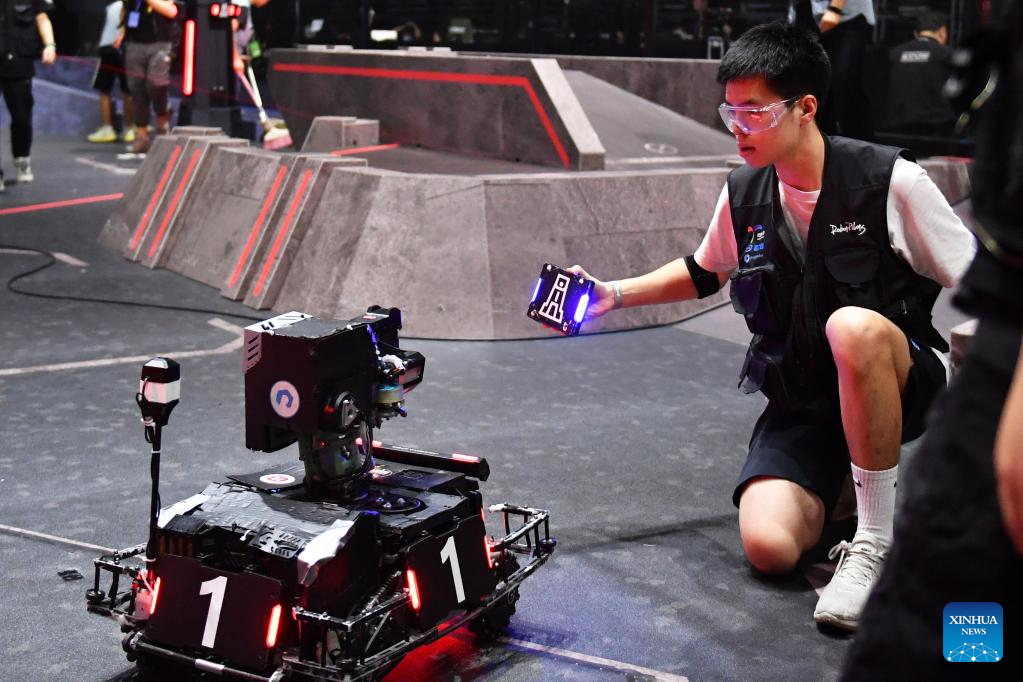 Un concursante del equipo TOE de la Universidad Jiaotong de Dalian prueba un robot durante la Competición Regional del Campeonato Universitario RoboMaster 2023 (sur de China) en Changsha, provincia central china de Hunan, el 28 de mayo de 2023. La competición regional de cuatro días concluyó en Changsha el domingo, con la victoria del equipo RobotPilots de la Universidad de Shenzhen y el equipo TOE de la Universidad Jiaotong de Dalian en segundo lugar. (Xinhua/Chen Zhenhai)
