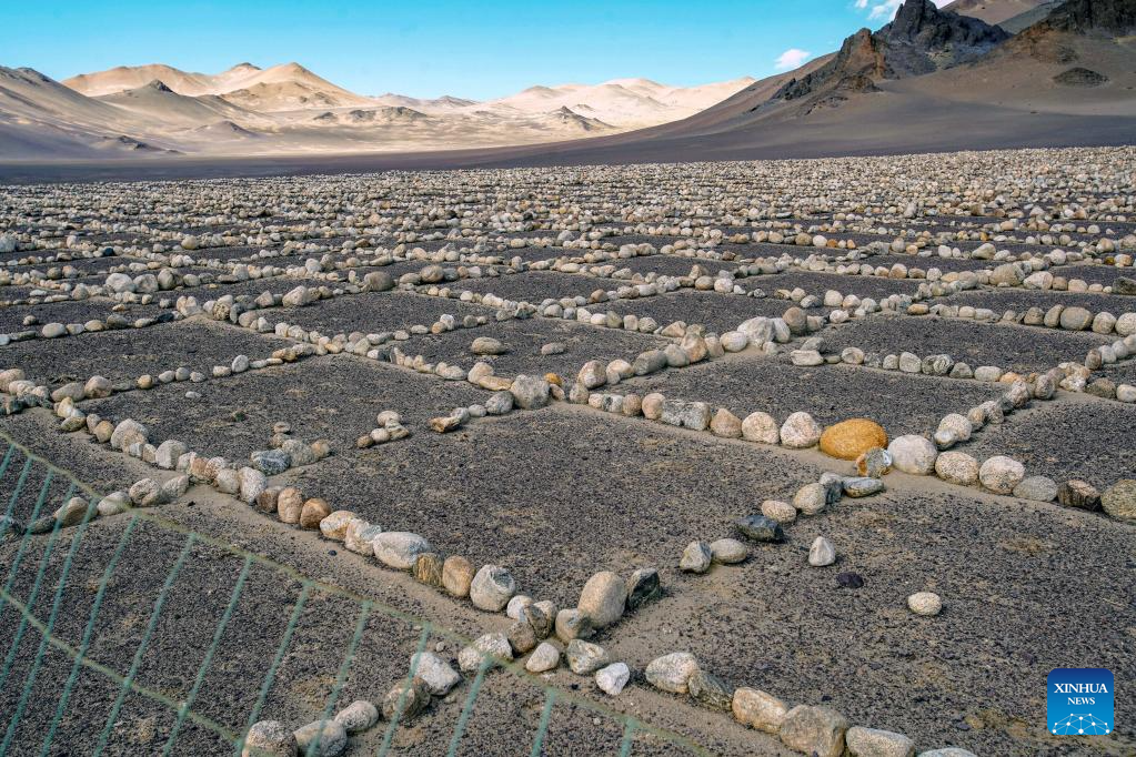 Esta foto tomada el 28 de mayo de 2023 muestra las cuadrículas de piedra a lo largo de una carretera en el municipio de Zhaxigang del distrito de Gar en la prefectura de Ngari, en la región autónoma del Tíbet en el suroeste de China. Las rejillas de piedra, que los aldeanos locales tardaron tres años en construir, desempeñan un papel importante en la protección de los pastos de invierno del viento y el daño de la arena, según Sonam Cering, subdirector del municipio de Zhaxigang. (Xinhua/Jigme Dorje)