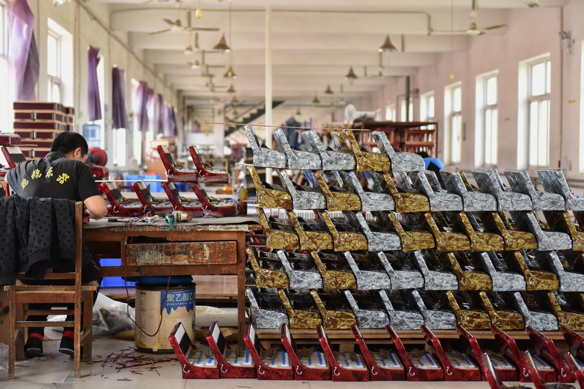Un trabajador ensambla acordeones en Tianjin Parrot Musical Instruments en Tianjin, el 25 de mayo. [Foto/Xinhua]