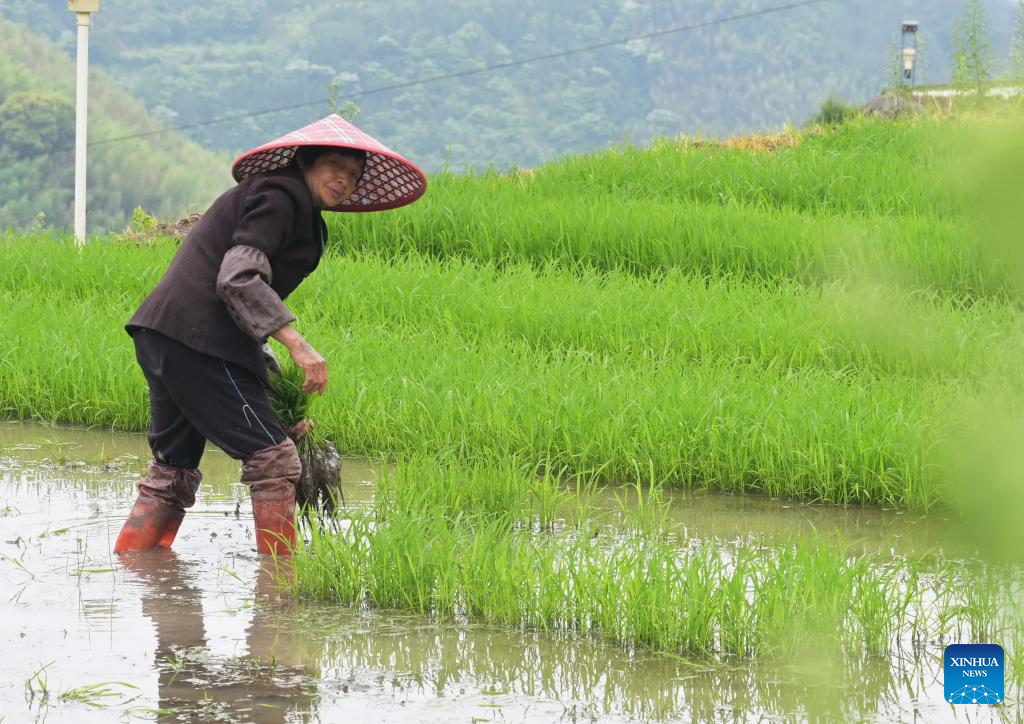 Fujian: Agricultores trabajan en campos en terraza en municipio de Lianhe de distrito de Youxi