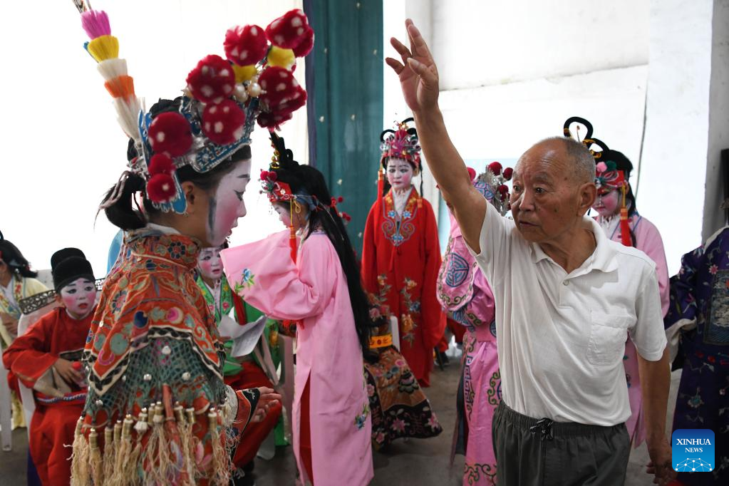 El anciano artista popular Shao Qianfeng (derecha, al frente) instruye a una estudiante antes de una exhibición de la Ópera de Anhui en la aldea de Fuling del distrito de Jixi, ciudad de Xuancheng, provincia oriental china de Anhui, 30 de mayo de 2023. Con el fin de promover la Ópera de Anhui y crear conciencia sobre el arte escénico tradicional, una escuela primaria en la aldea de Fuling viene ofreciendo un programa de capacitación desde 2003 para sus estudiantes, contratando a artistas folclóricos veteranos como tutores. (Xinhua/Zhang Duan)