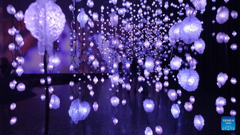 Los visitantes son fotografiados dentro de Pixel Forest, una presentación inmersiva de la artista suiza Pipilotti Rist, en el Museo de Bellas Artes, Houston, Texas, Estados Unidos, el 31 de mayo de 2023. La exposición de Pipilotti Rist titulada Pixel Forest and Worry Will Vanish se inauguró en dicho museo el 12 de marzo y estará abierta al público hasta el 4 de septiembre. (Xinhua/Xu Jianmei)
