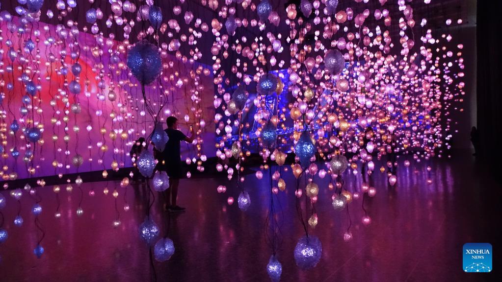 Un visitante toma fotografías dentro de Pixel Forest, una presentación inmersiva de la artista suiza Pipilotti Rist, en el Museo de Bellas Artes, Houston, Texas, Estados Unidos, el 31 de mayo de 2023. La exposición de Pipilotti Rist titulada Pixel Forest and Worry Will Vanish se inauguró en dicho museo el 12 de marzo y estará abierta al público hasta el 4 de septiembre. (Xinhua/Xu Jianmei)