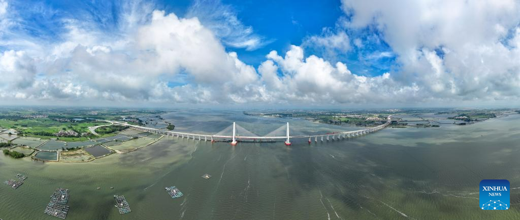 Esta foto aérea panorámica tomada el 25 de mayo de 2023 muestra el gran puente de Luzhou en construcción en la ciudad de Zhanjiang, provincia de Guangdong, sur de China. El gran puente de Luzhou, con una longitud total de 562 metros y un tramo principal de 300 metros, ha entrado en la etapa final de su construcción. (Xinhua/Liu Dawei)