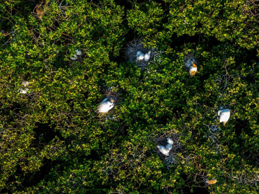 Las garcetas construyen sus nidos en un bosque de manglares en el sureste de China