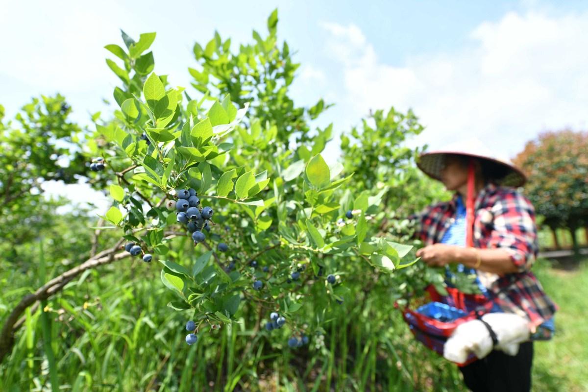 Locales recogen arándanos en el distrito de Majiang, provincia de Guizhou, 4 de junio de 2023. [Xinhua]