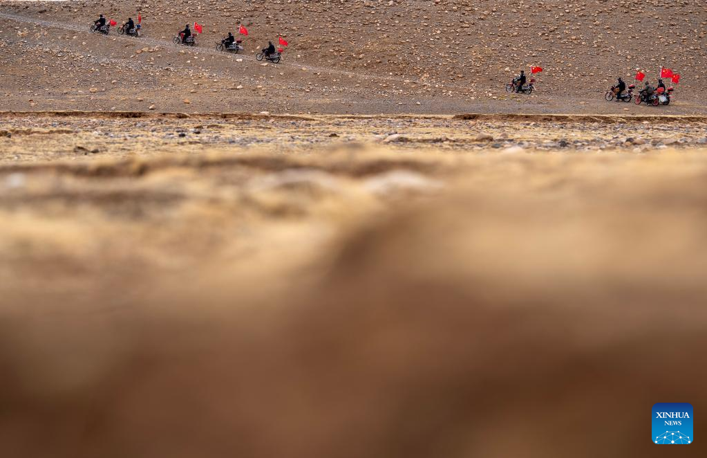 Miembros del equipo de defensa fronteriza patrullan en motocicletas en el municipio de Changgo de la ciudad de Xigaze, región autónoma del Tíbet en el suroeste de China, el 2 de junio de 2023. El municipio de Changgo, con una elevación promedio de más de 5.000 metros, es un municipio fronterizo adyacente a Nepal con una frontera de 105 kilómetros.