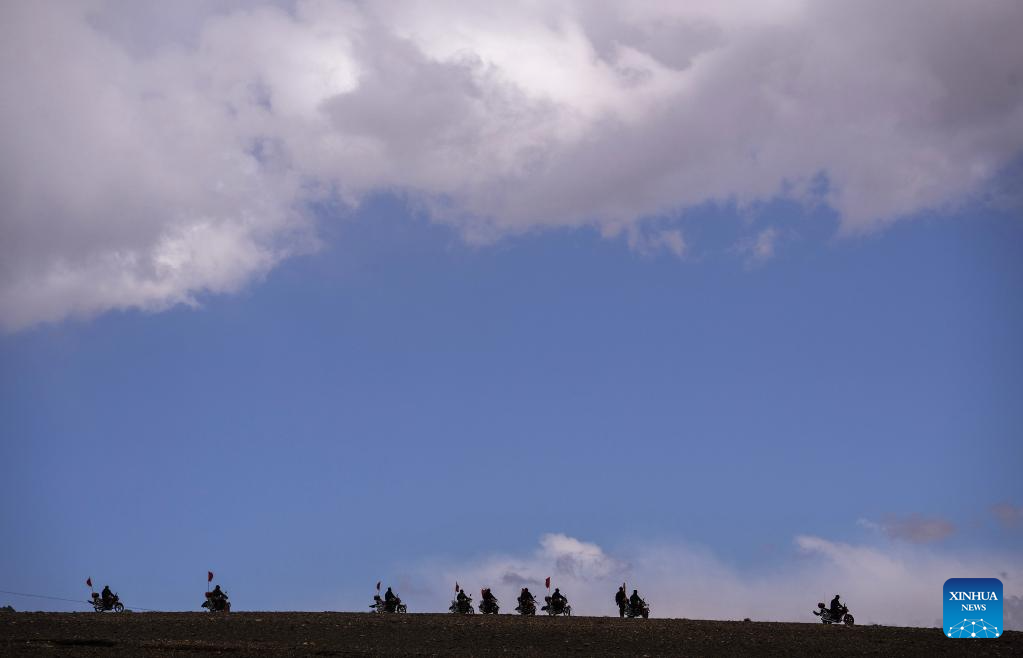 Miembros del equipo de defensa fronteriza patrullan en motocicletas en el municipio de Changgo de la ciudad de Xigaze, región autónoma del Tíbet en el suroeste de China, el 2 de junio de 2023. El municipio de Changgo, con una elevación promedio de más de 5.000 metros, es un municipio fronterizo adyacente a Nepal con una frontera de 105 kilómetros.
