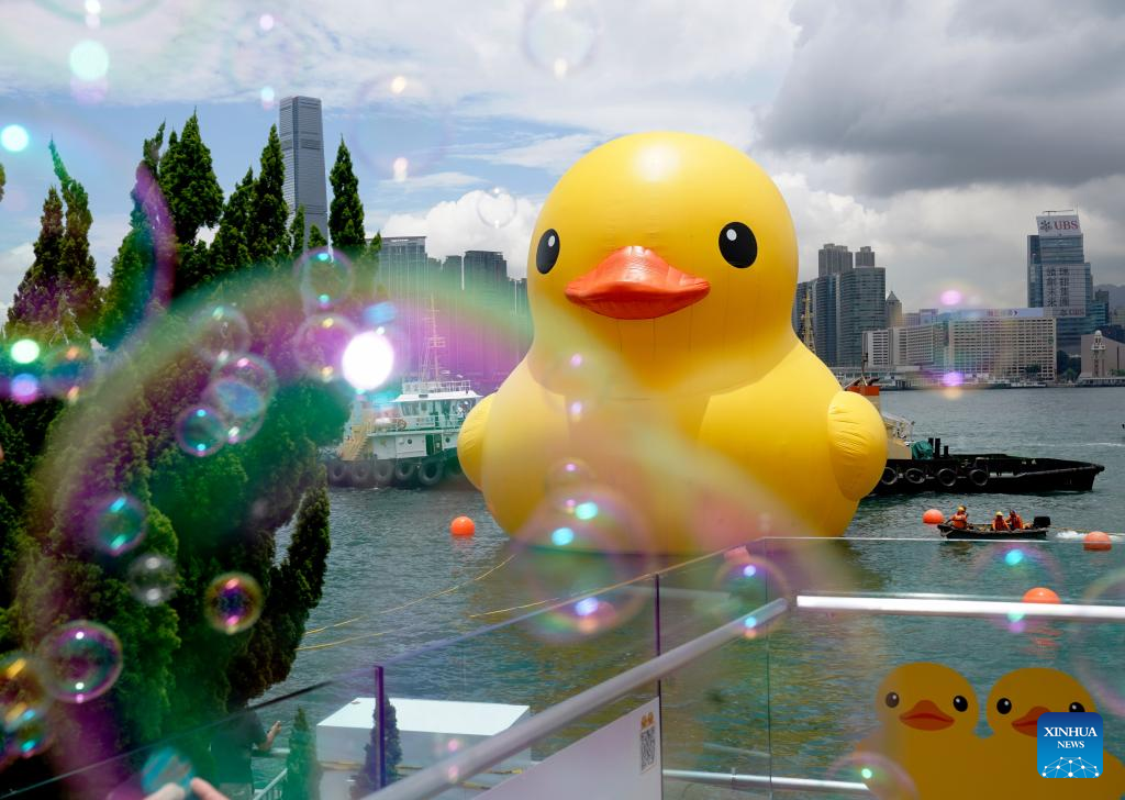 Un pato de goma amarillo gigante visto a través de pompas de jabón y un arco iris en el puerto de Victoria en Hong Kong, sur de China, el 9 de junio de 2023. (Xinhua/Wang Shen)