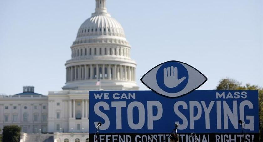 Un enorme cartel con un lema de protesta colocado frente al edificio del Capitolio de Estados Unidos durante una protesta contra la vigilancia gubernamental en Washington D. C., capital de Estados Unidos, el 26 de octubre de 2013. [Foto/Xinhua]