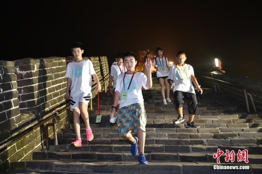 Jóvenes extranjeros disfrutan de la vista nocturna de la Gran Muralla